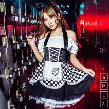 レースをあしらったデザイン性の高いブラックでシックなドレスをベースに、ブロック柄やブラックレースなどのレイヤードやミニエプロンの時計マークなど、まるでアリスとウサギが混ざったような世界観が可愛く表現できています。
